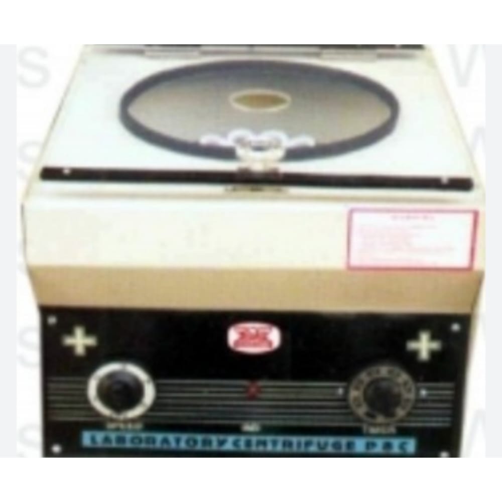Centrifuge: A low priced unit meeting the small capacity centrifuging requirement of medical practitioners, pathological laboratories and hospital routine centrifuging tests. The standard unit is fitted with resiliently mounted motor for vibration free performance, a built in 5 step speed regulator and one non removable swing rotor. Complete with tube earners.