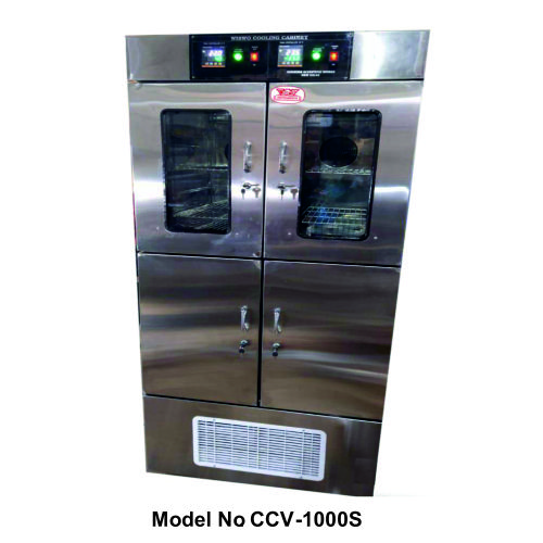 Vertical cooling cabinet double walled Outer body made by CRCA sheet duly powder coated 20 SWG, and inner chamber is made of stainless steel 304 AISI with 20 SWG corrosion resistant stainless steel buffed to mirror polish (test certificate provided). 80mm thick CFC-free Polyurethane (PUF) used as a thermal insulation with low thermal conductivity. Breaker strips used to seal the insulation eliminating heat transfer. Each deck (Chamber) is provided with two front opening doors.